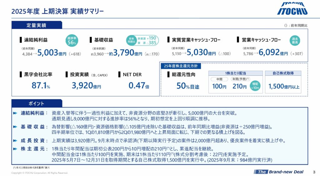 今回の決算は「本業収益は外部環境の影響を受けつつも、非資源事業が底支えし、利益・CFは高水準維持」という構図でした。