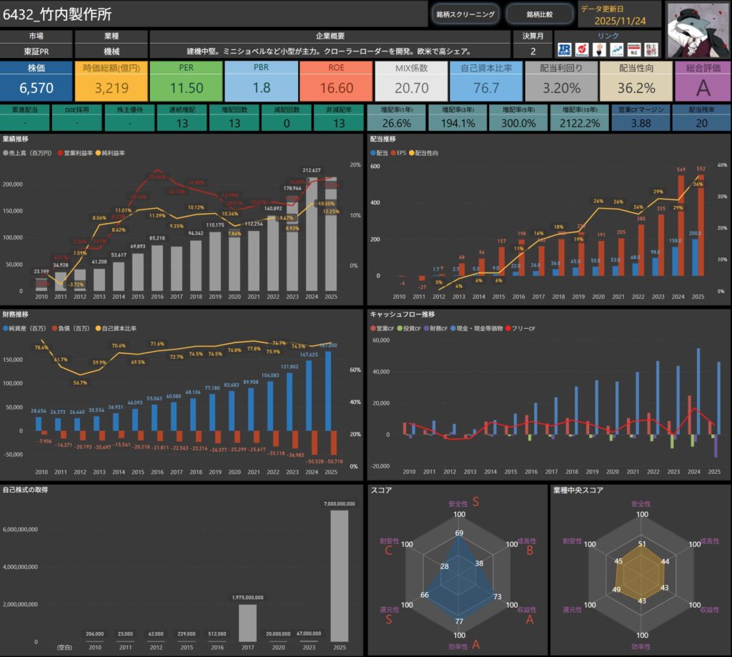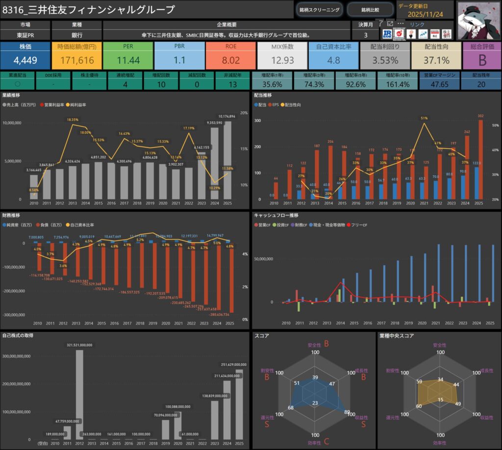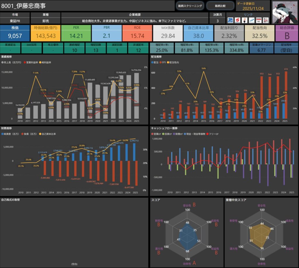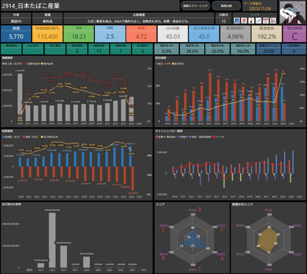 株価・配当利回り・ROE・自己資本比率などの基本データに加え、増配率やキャッシュフロー推移まで確認できます。