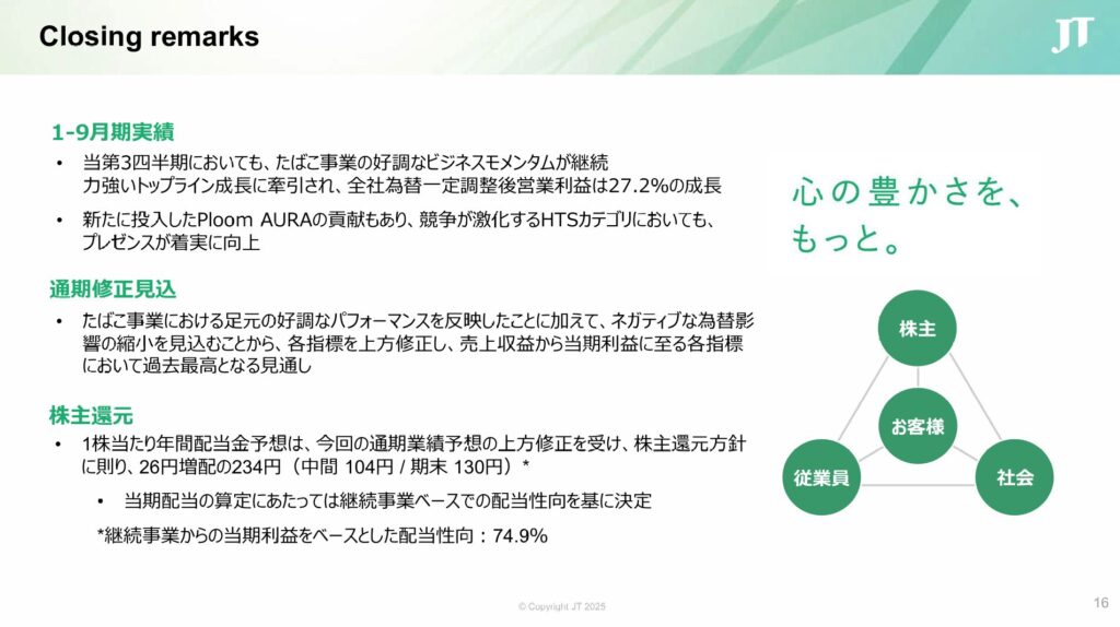 今回の上方修正と増配が示されたことで、増配姿勢の継続性が改めて確認できました。