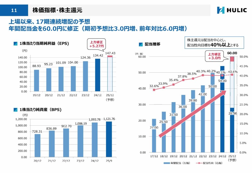 ヒューリックの株主還元は、配当性向40%以上を軸にした明確な方針が特徴です。
