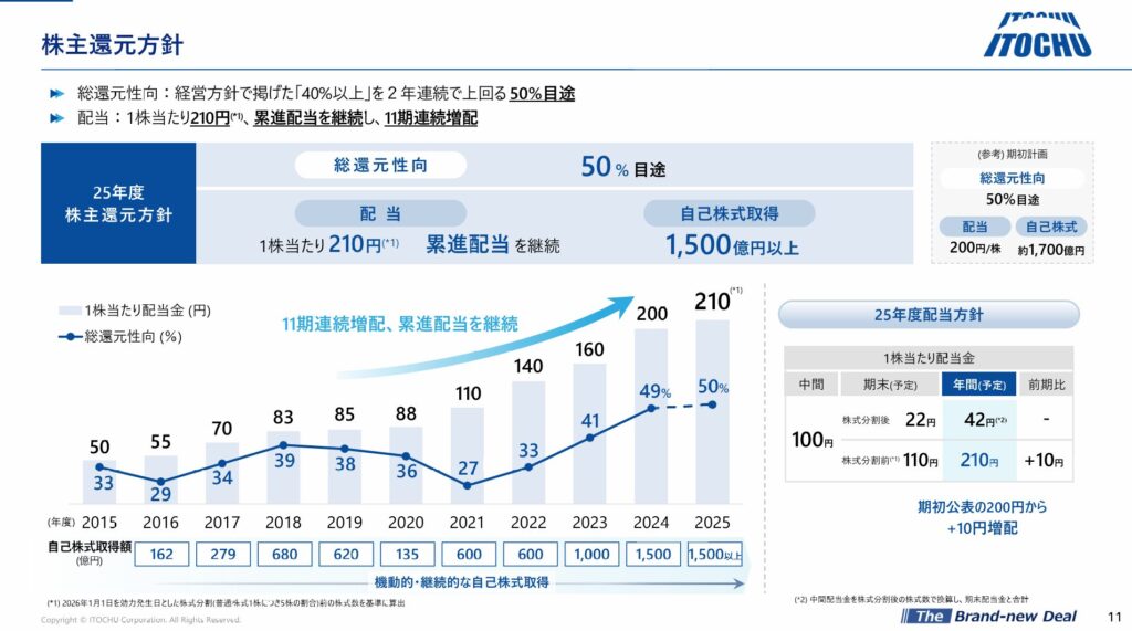 - 伊藤忠商事は経営方針として掲げている総還元性向40%以上を継続しながら、2025年度はその水準をさらに上回る50%を目安としています。