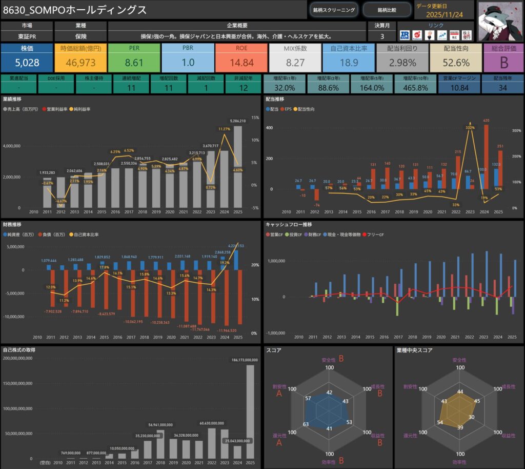 SOMPOホールディングスは、保険×介護×海外事業の組み合わせという独自性のある収益構造が特徴で、足元の決算では利益回復が鮮明になった印象です。