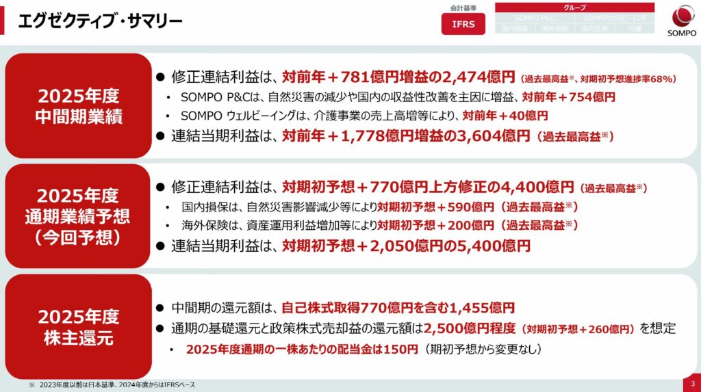 - SOMPOは株主還元方針として、配当と自己株式取得を組み合わせた総還元型の政策を継続しています。
