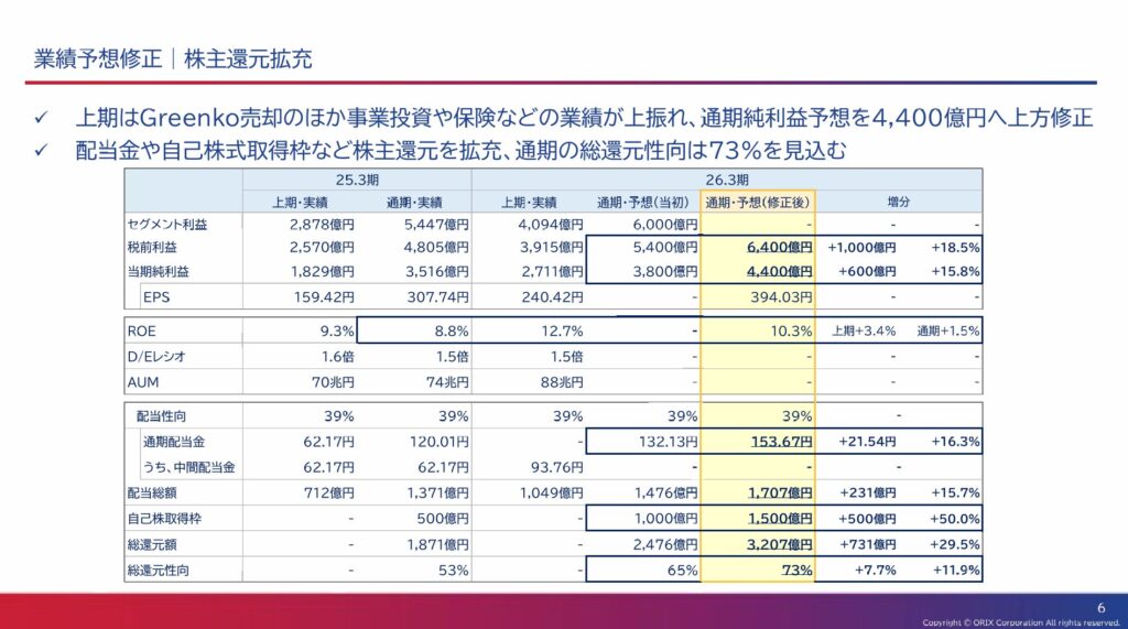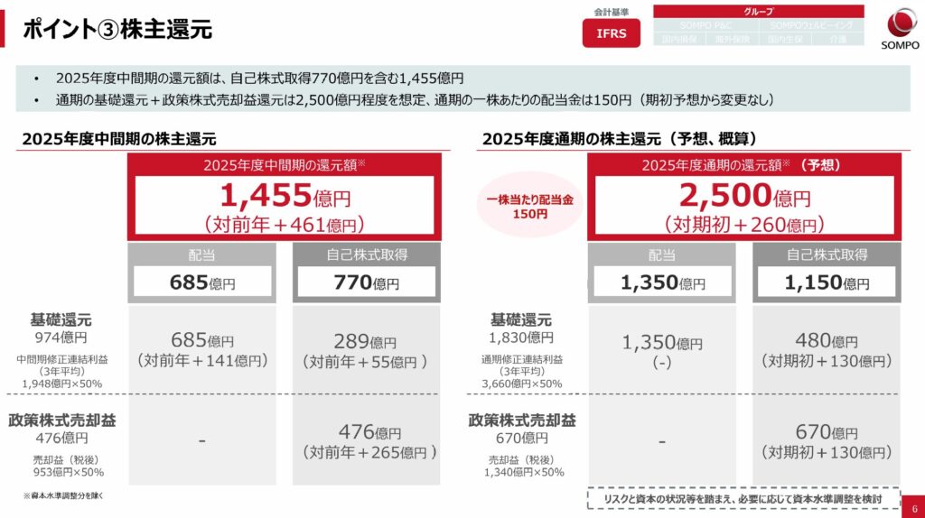 - 通期では2,500億円規模の還元を計画しており、基礎還元に加えて政策株式の売却益を活用した柔軟な還元姿勢が特徴です。