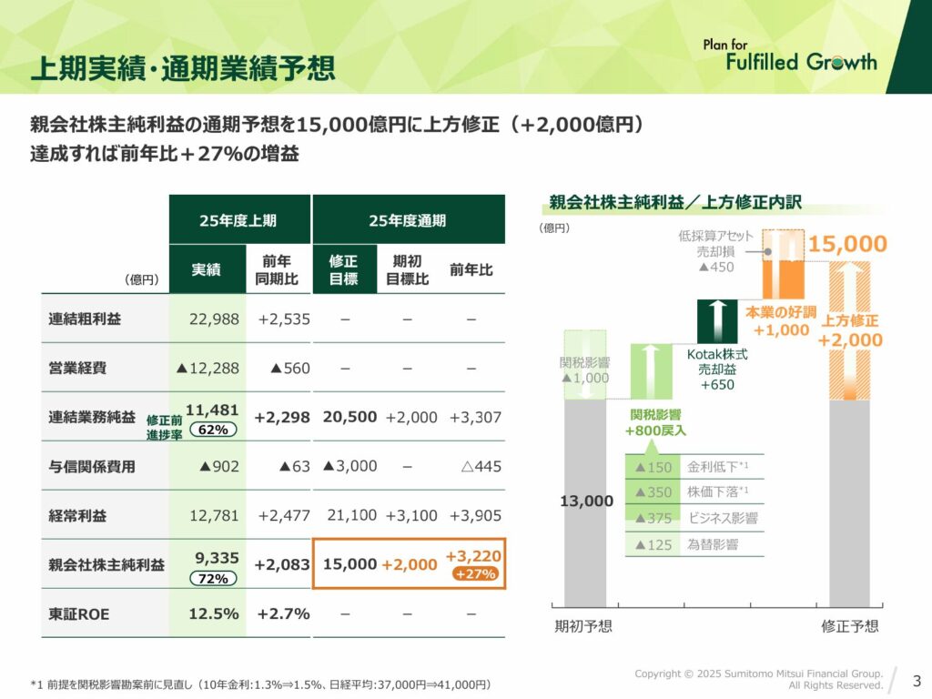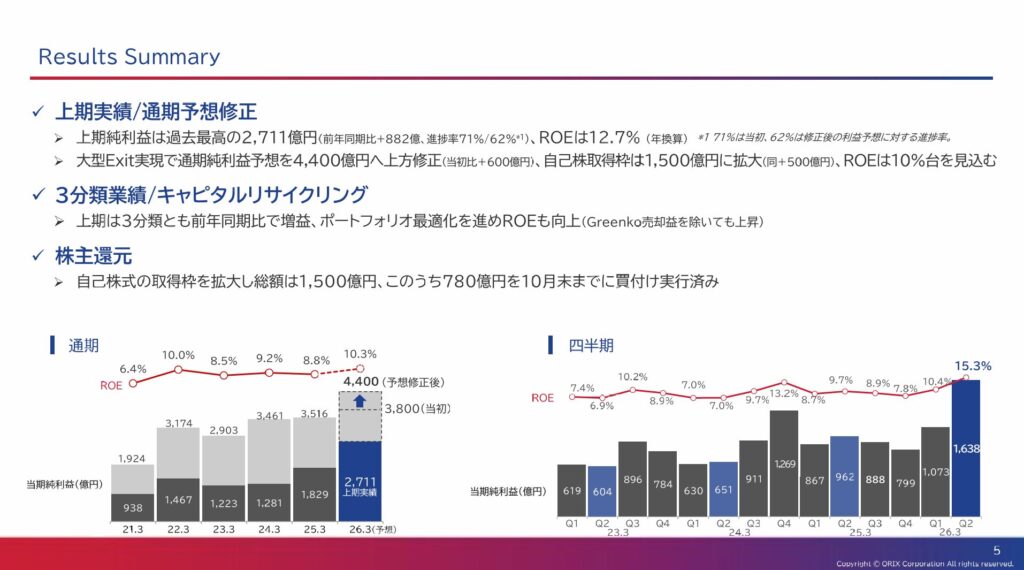 - 通期見通し:親会社利益予想5,400億円(前期比+122.1%)を据え置き