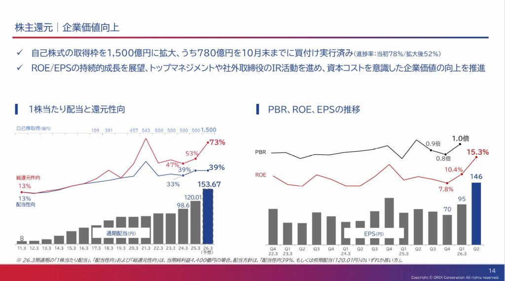 一方で、ROE14%超、配当性向50%超と、資本効率と還元姿勢のバランスがとれている点が印象的です。