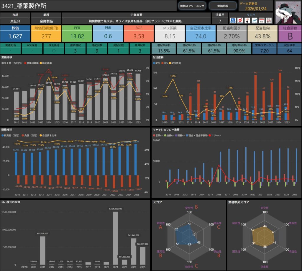 株価・配当利回り・ROE・自己資本比率などの基本データに加え、増配率やキャッシュフロー推移まで確認できます。