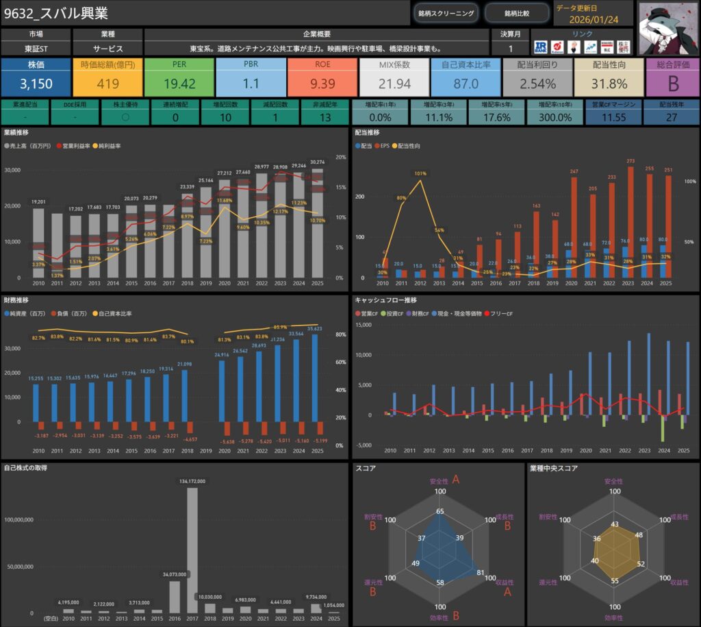- スバル興業は、道路メンテナンスや公共工事を中心に安定した需要が見込める事業を展開しており、景気に左右されにくいビジネスモデルが強みです。