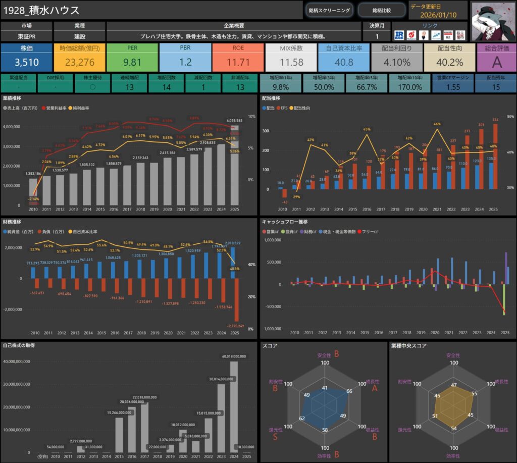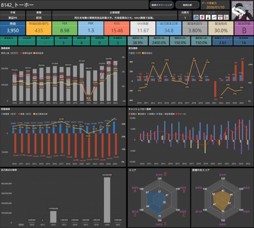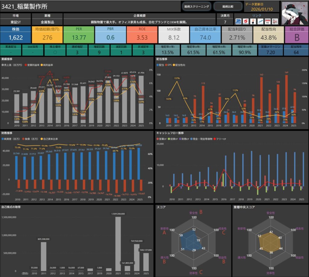 株価・配当利回り・ROE・自己資本比率などの基本データに加え、増配率やキャッシュフロー推移まで確認できます。