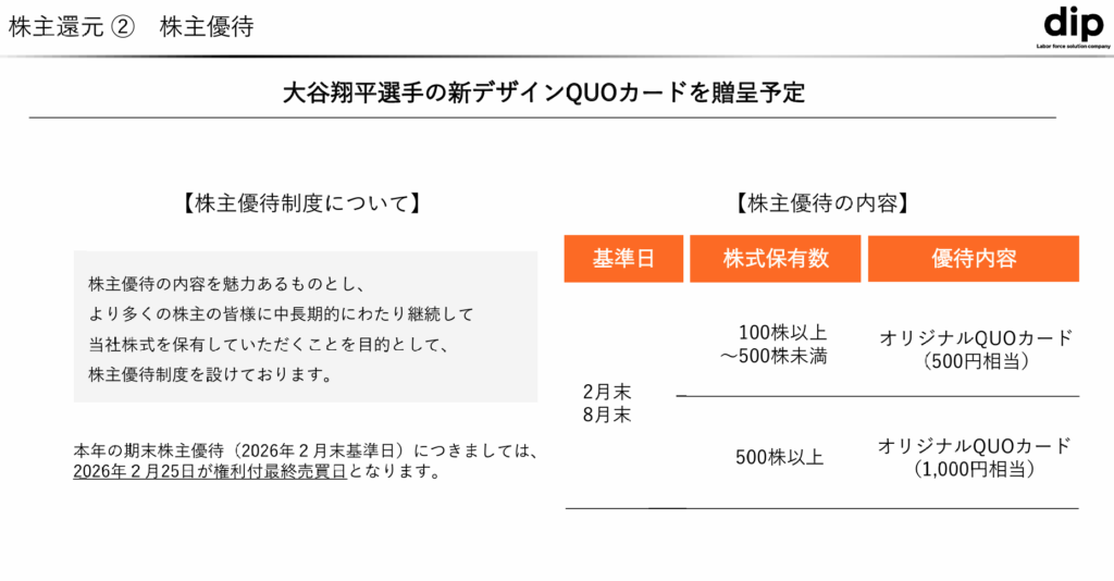 ディップでは、株主への還元施策の一環として、QUOカードによる株主優待制度を実施しています。