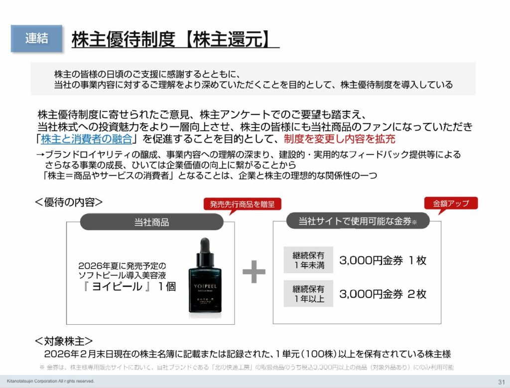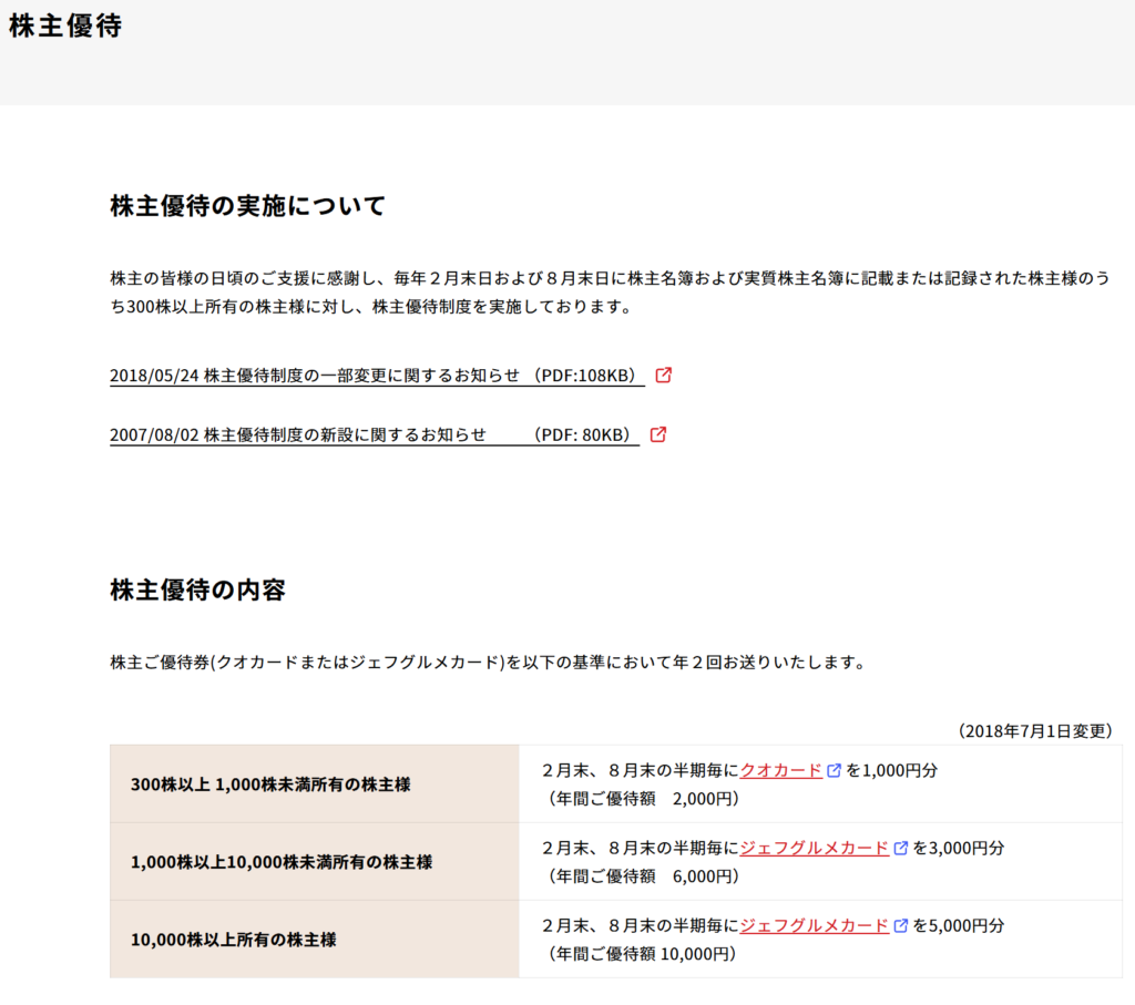- 株主優待は、自社グループで使える商品券という実用性の高い内容です。