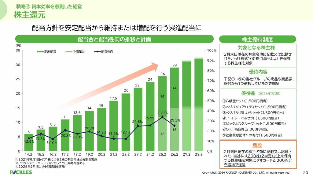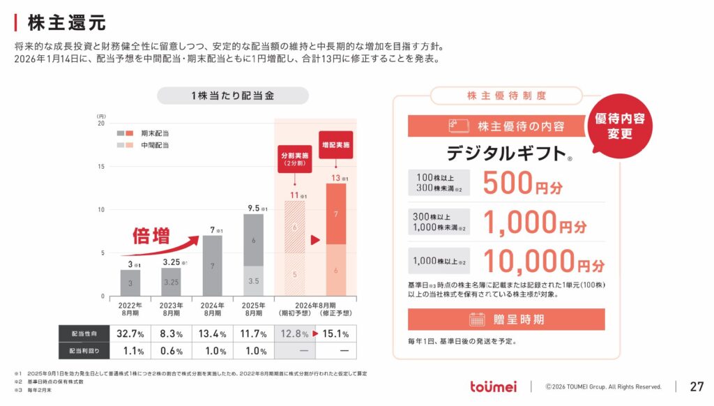 - これに加えて、商品券・食品・ギフトカードなど選択肢のある株主優待が用意されており、トータルでの還元満足度を底上げしています。
