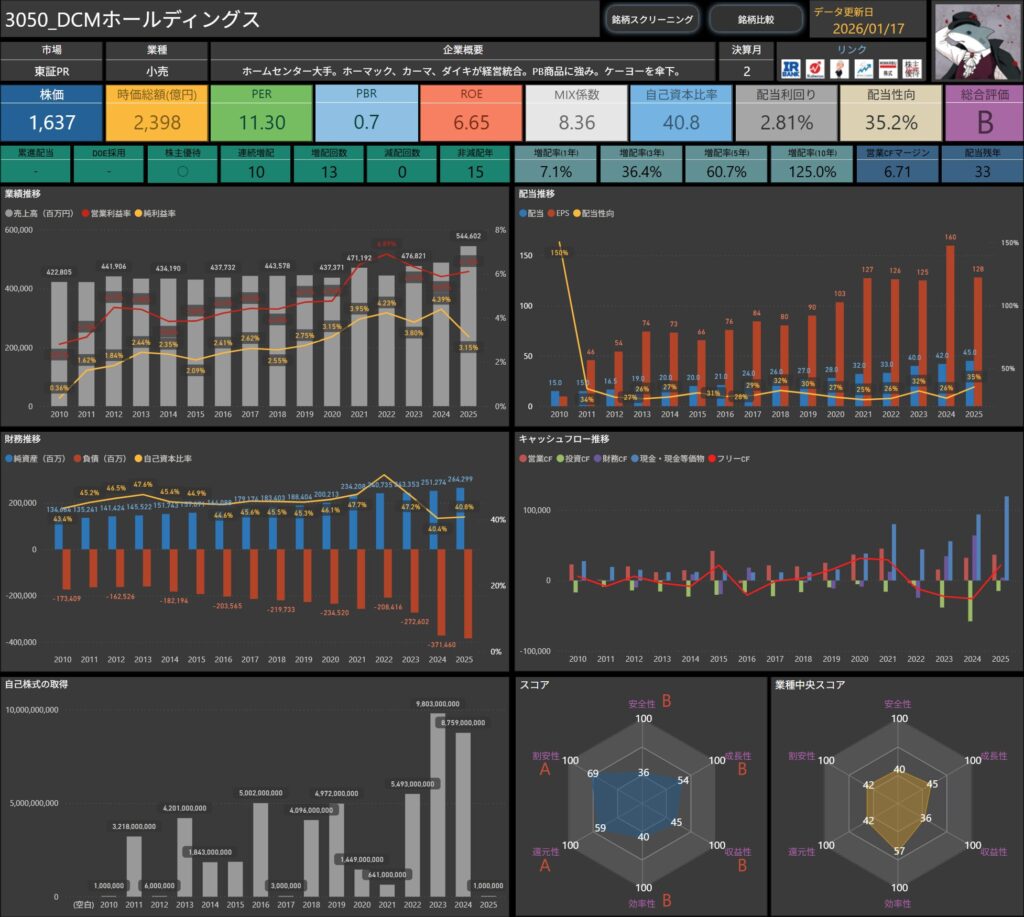 株価・配当利回り・ROE・自己資本比率などの基本データに加え、増配率やキャッシュフロー推移まで確認できます。