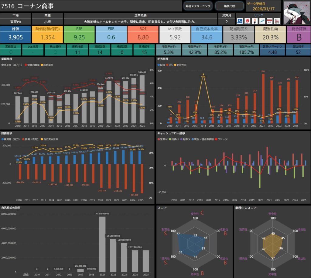 コーナン商事は、生活密着型のホームセンター事業による安定需要と、長期にわたる増配実績が魅力のインカム寄り銘柄です。