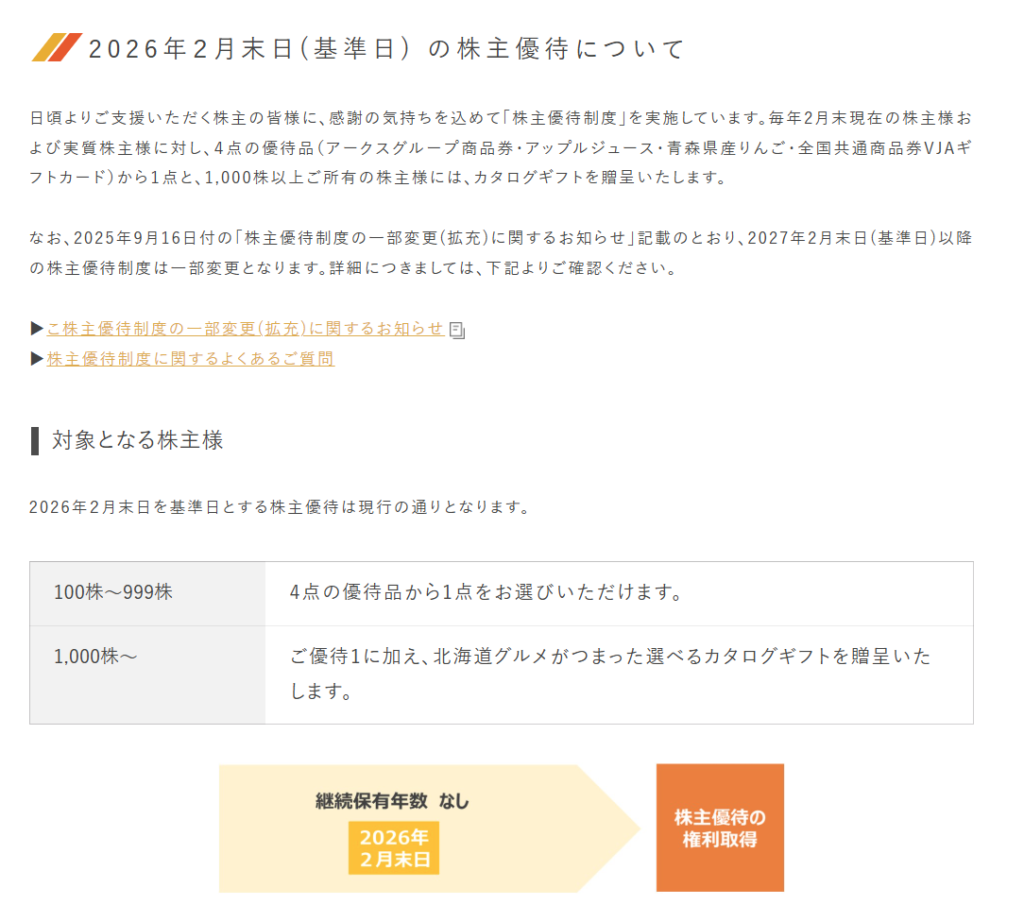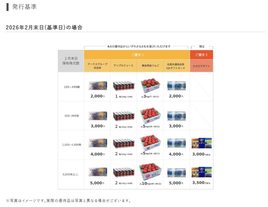 | 100株~999株 | 以下4点の優待品から 1点選択 ・アークスグループ商品券(2,000円相当) ・アップルジュース(青森県産りんご使用) ・青森県産りんご ・全国共通商品券 VJAギフトカード(2,000円相当) |