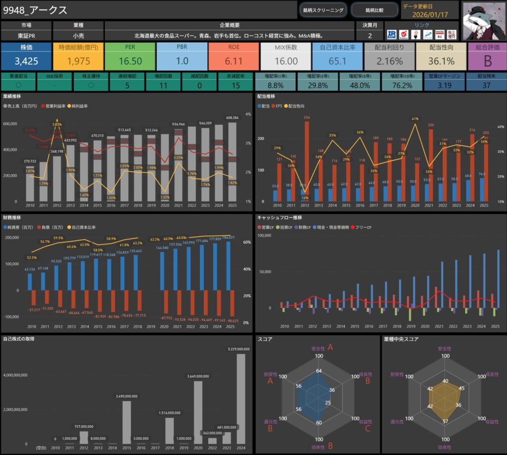アークスは、地域密着型の食品スーパーとしての安定感と、堅実な株主還元姿勢が特徴の銘柄です。