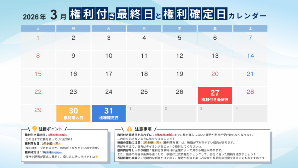 2026年3月の権利確定日は3月31日(火)、権利付き最終日は3月27日(金)となっています。