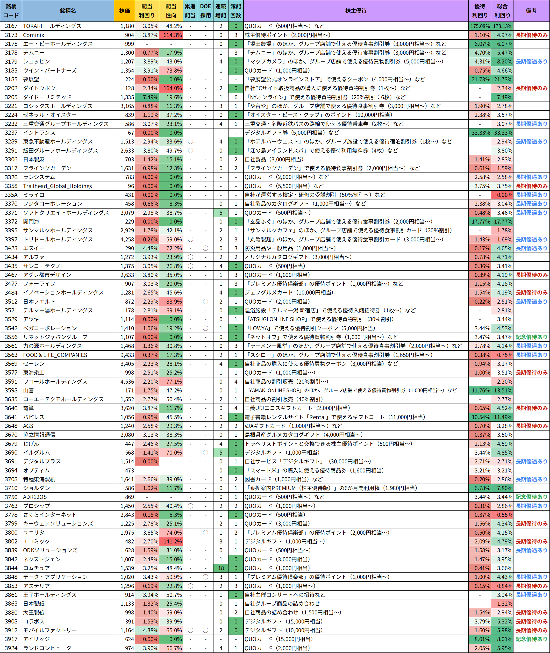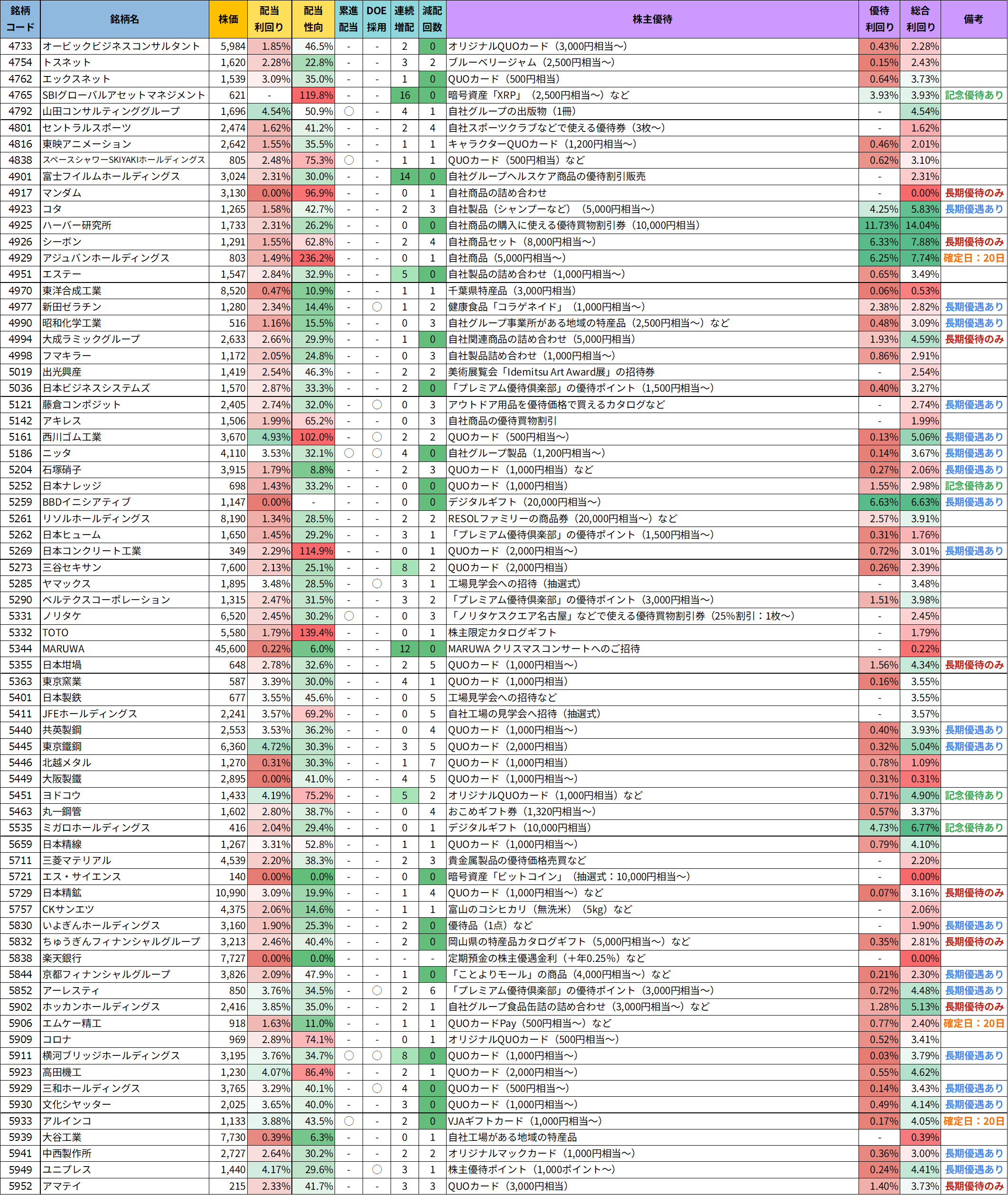 今回ご紹介する株主優待銘柄を、より見やすく整理した「優待銘柄リスト」をご用意しました。