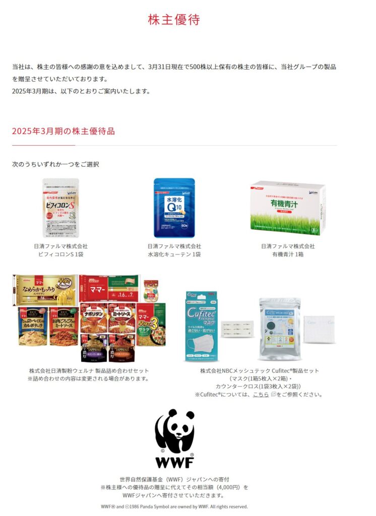 日清製粉グループ本社では、株主への感謝の意を込めて、毎年3月31日時点で500株以上を保有する株主を対象に、自社グループ製品等を中心とした株主優待制度を実施しています。