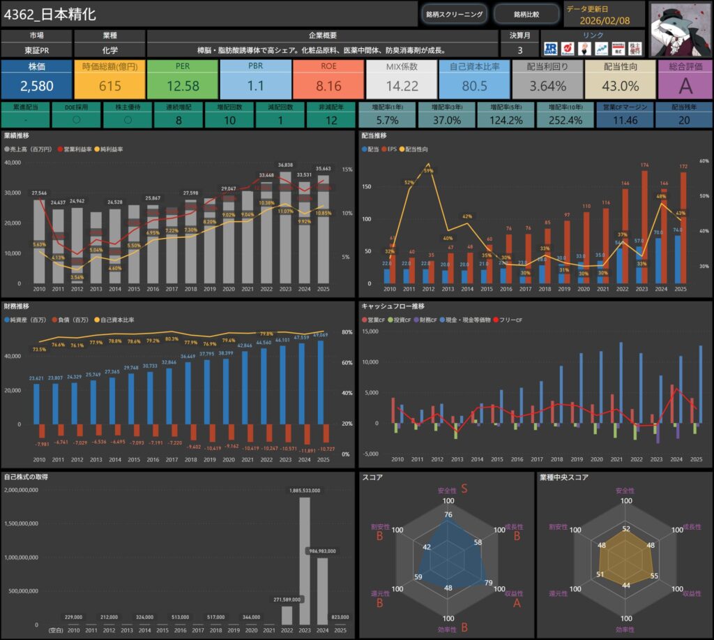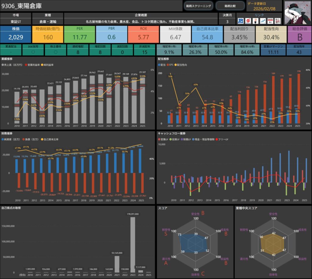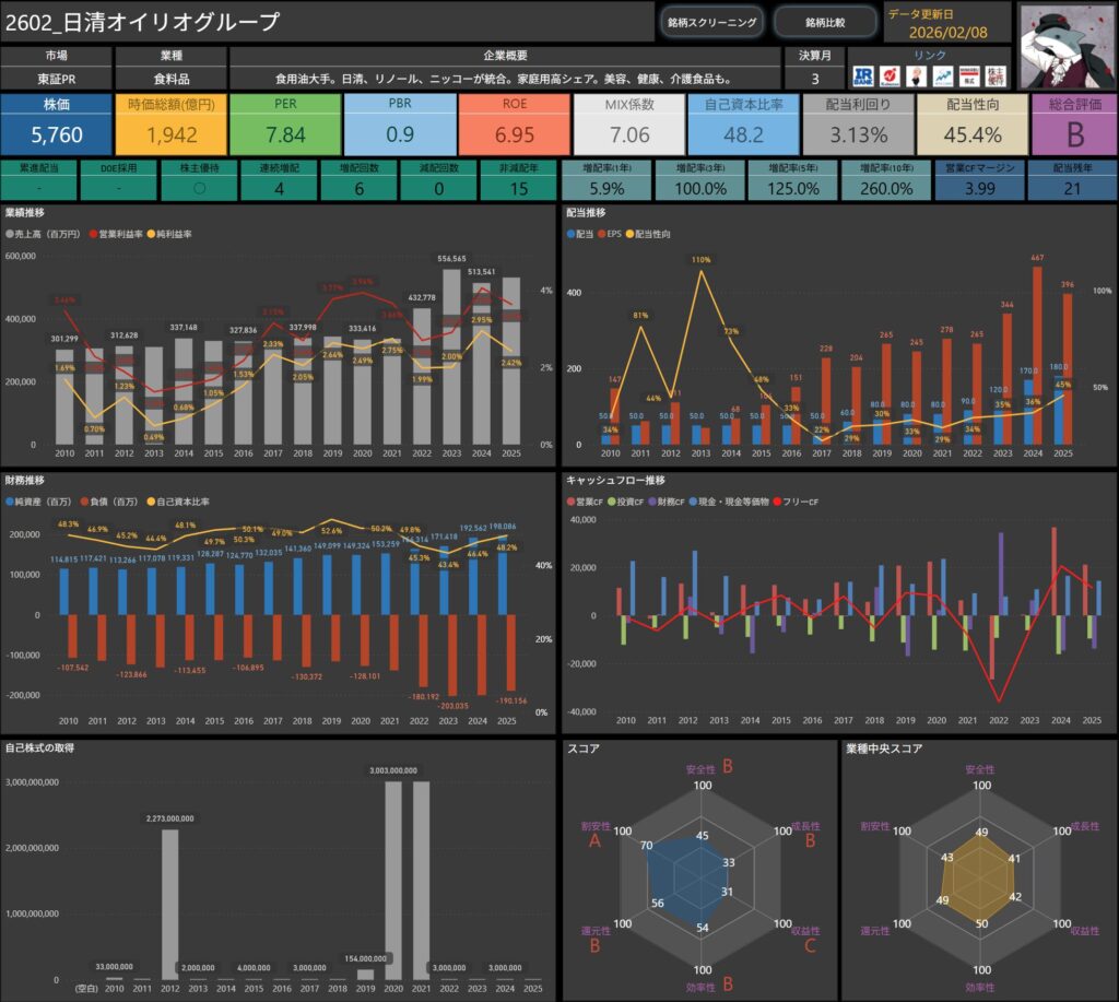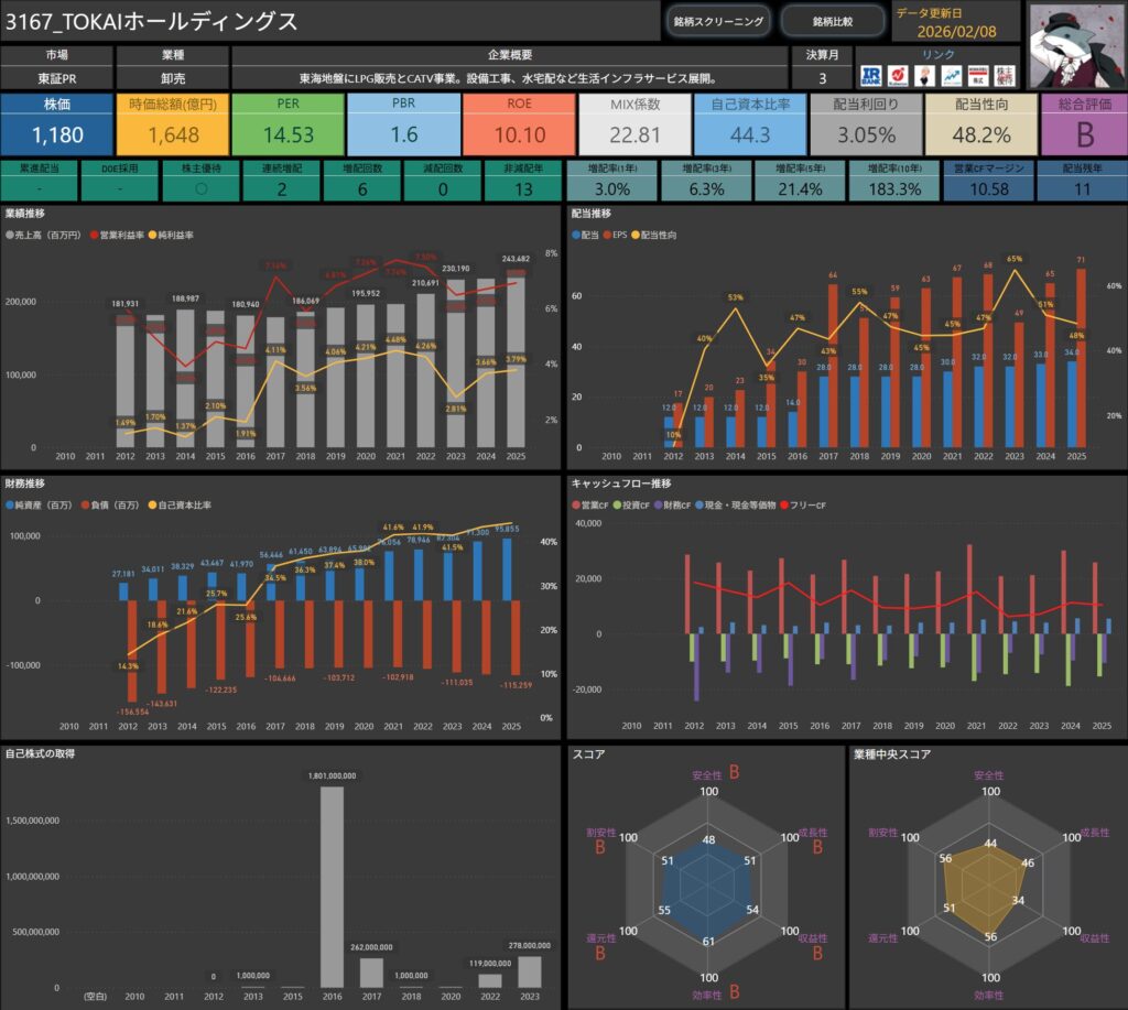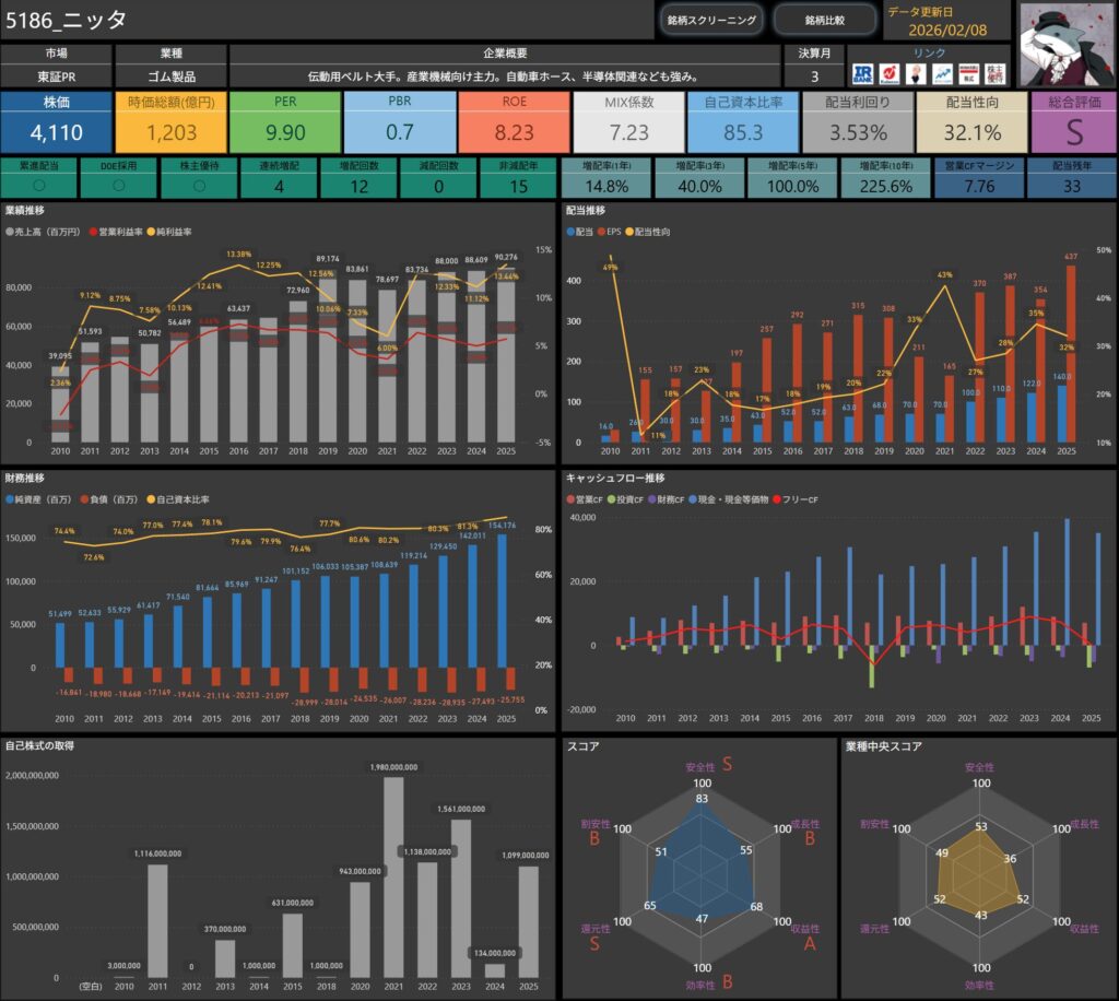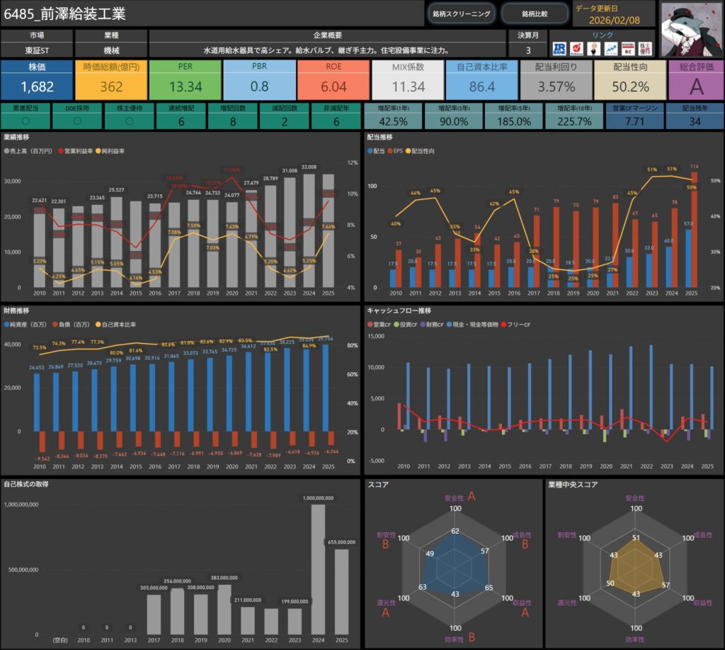 株価・配当利回り・ROE・自己資本比率などの基本データに加え、増配率やキャッシュフロー推移まで確認できます。