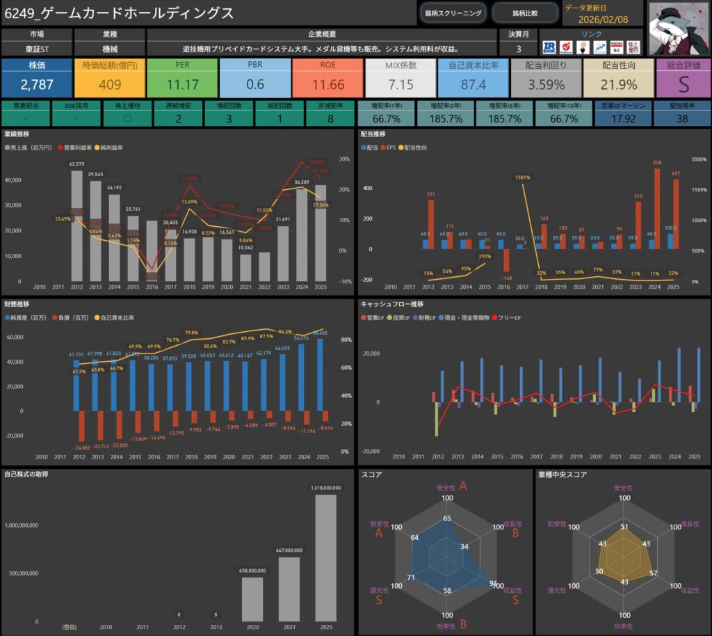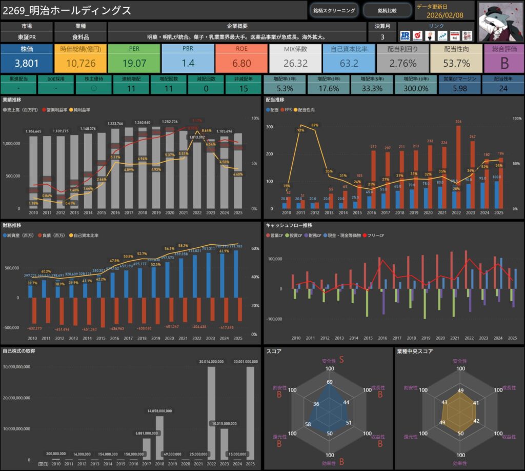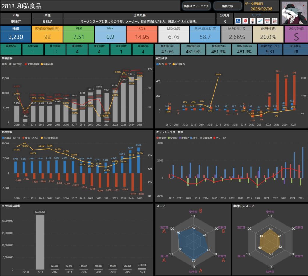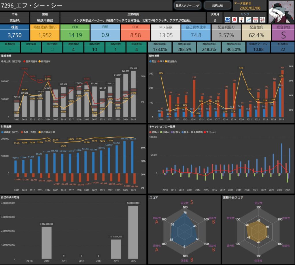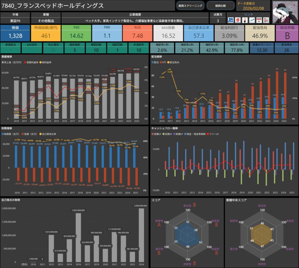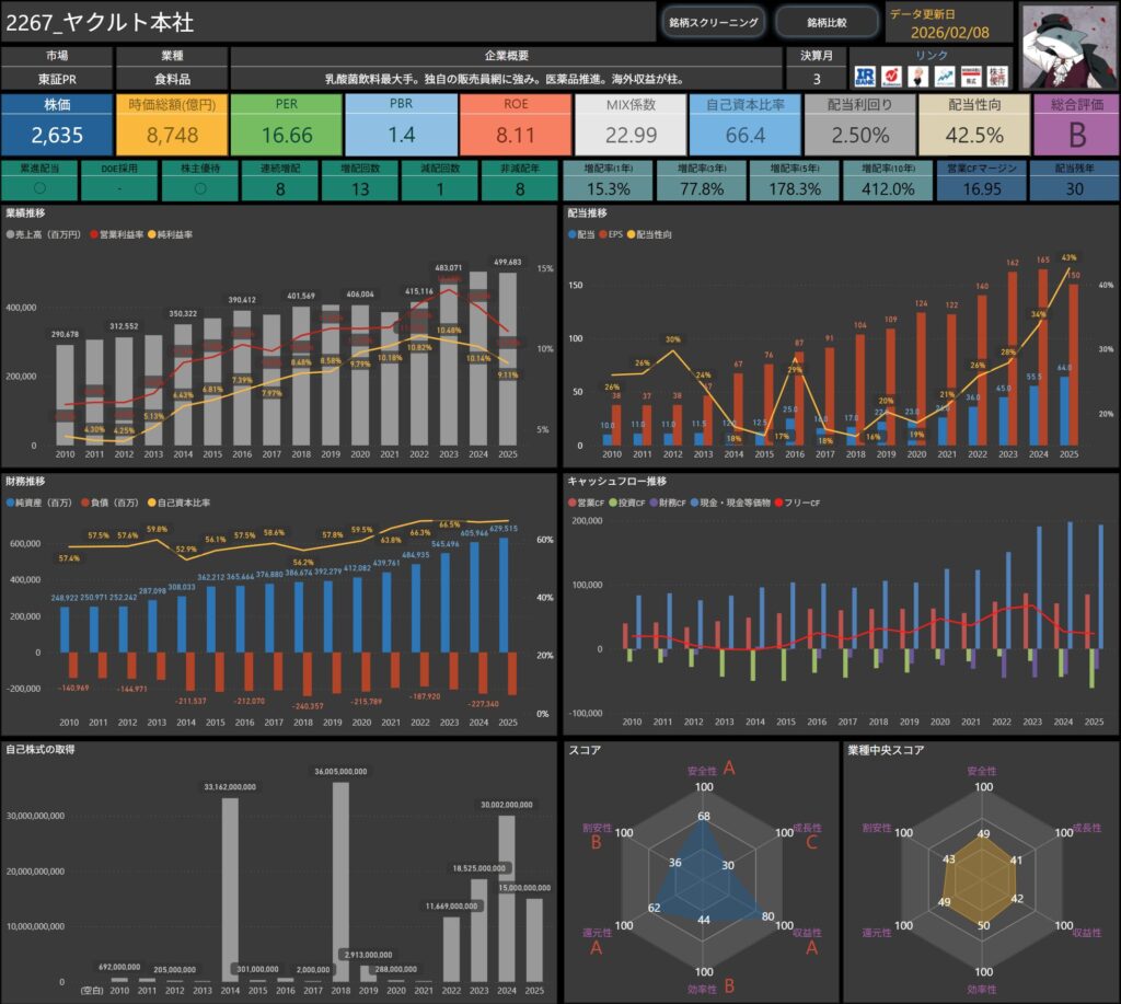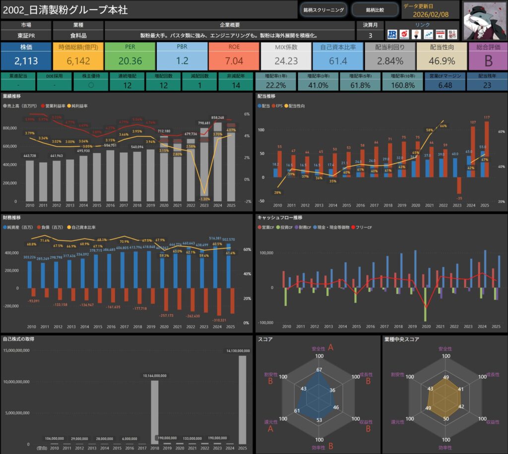 株価・配当利回り・ROE・自己資本比率などの基本データに加え、増配率やキャッシュフロー推移まで確認できます。