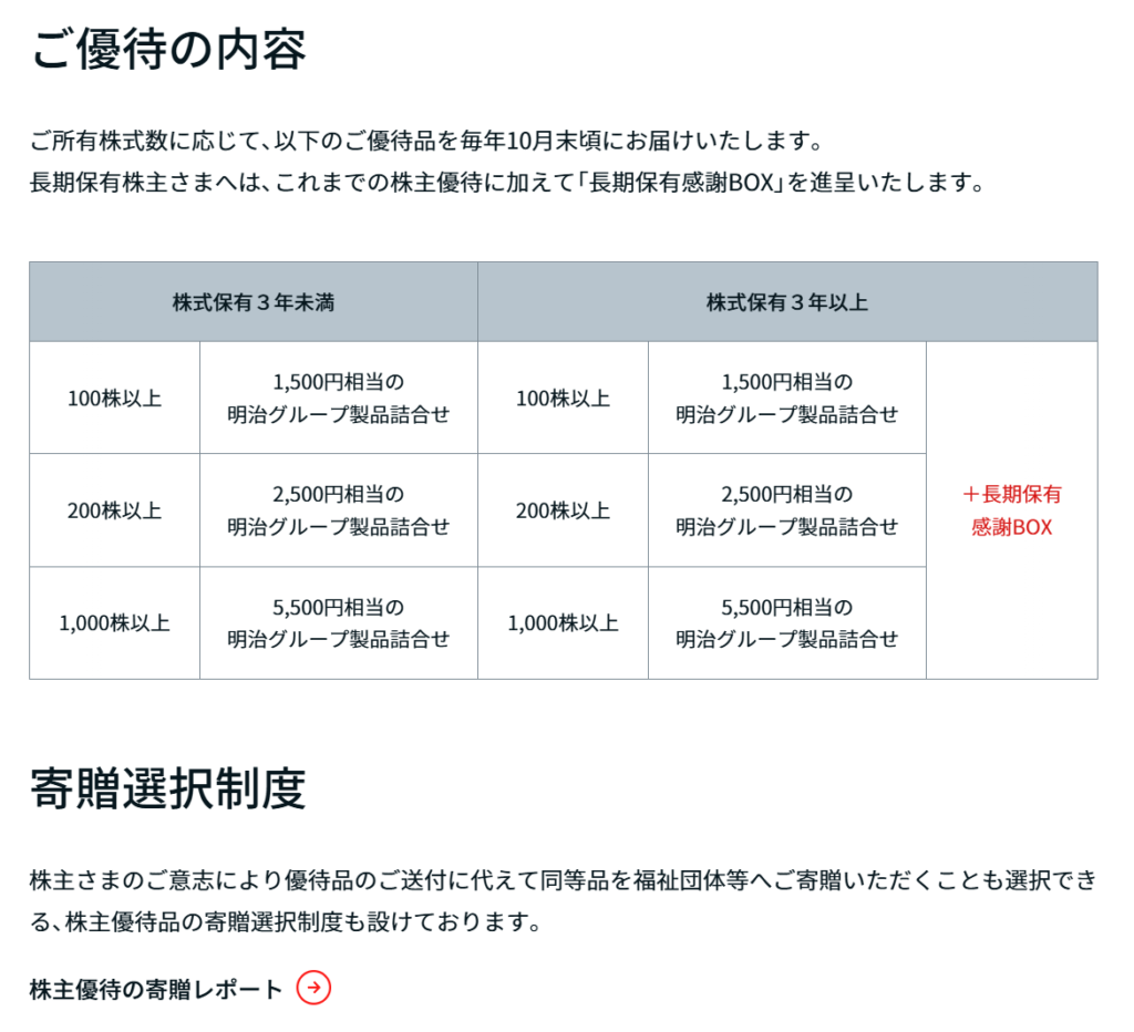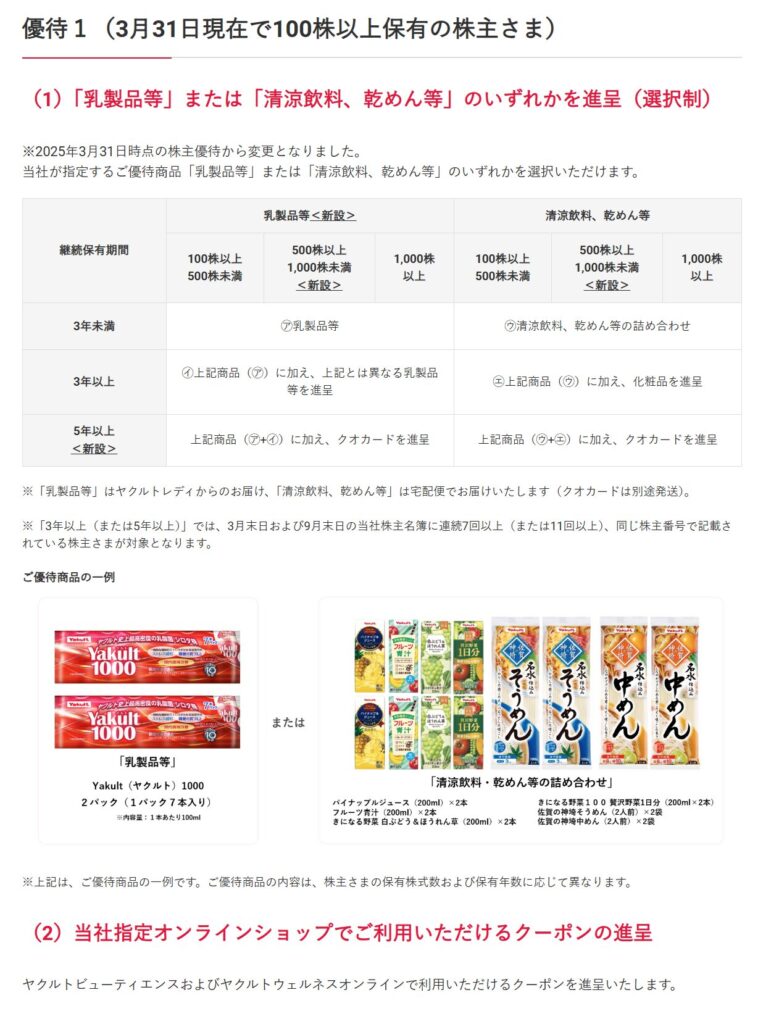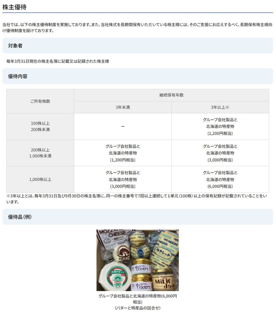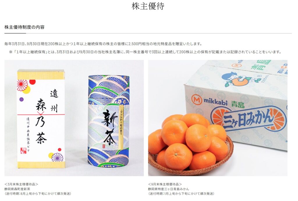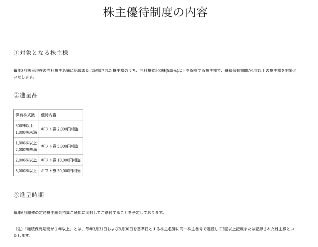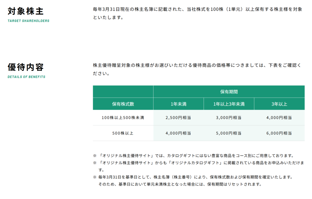 100株以上の保有と一定期間以上の継続保有が条件となっており、短期保有では優待を受け取れない点が特徴です。