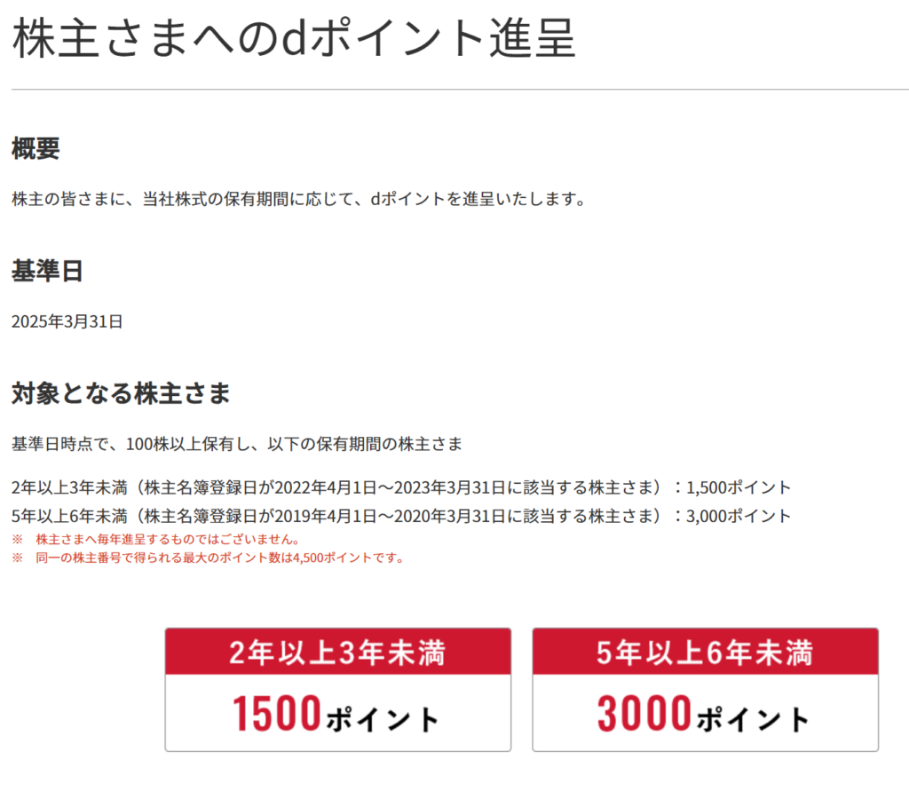 100株以上2年以上3年未満dポイント 1,500ポイント