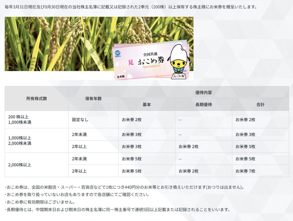 加えて、200株から受け取れるお米券の株主優待があり、配当と組み合わせることで長期保有時の満足度を底上げしてくれます。