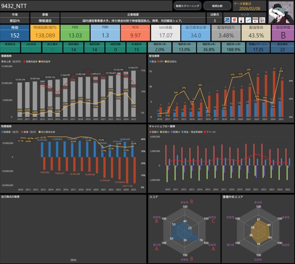 通信という生活・社会に不可欠な事業を軸に、景気変動の影響を受けにくい収益構造を持っている点は、長期保有を考えるうえで大きな安心材料といえます。