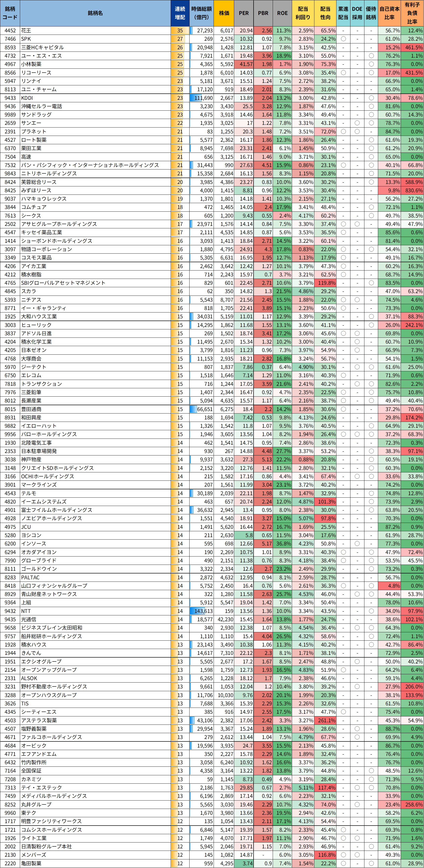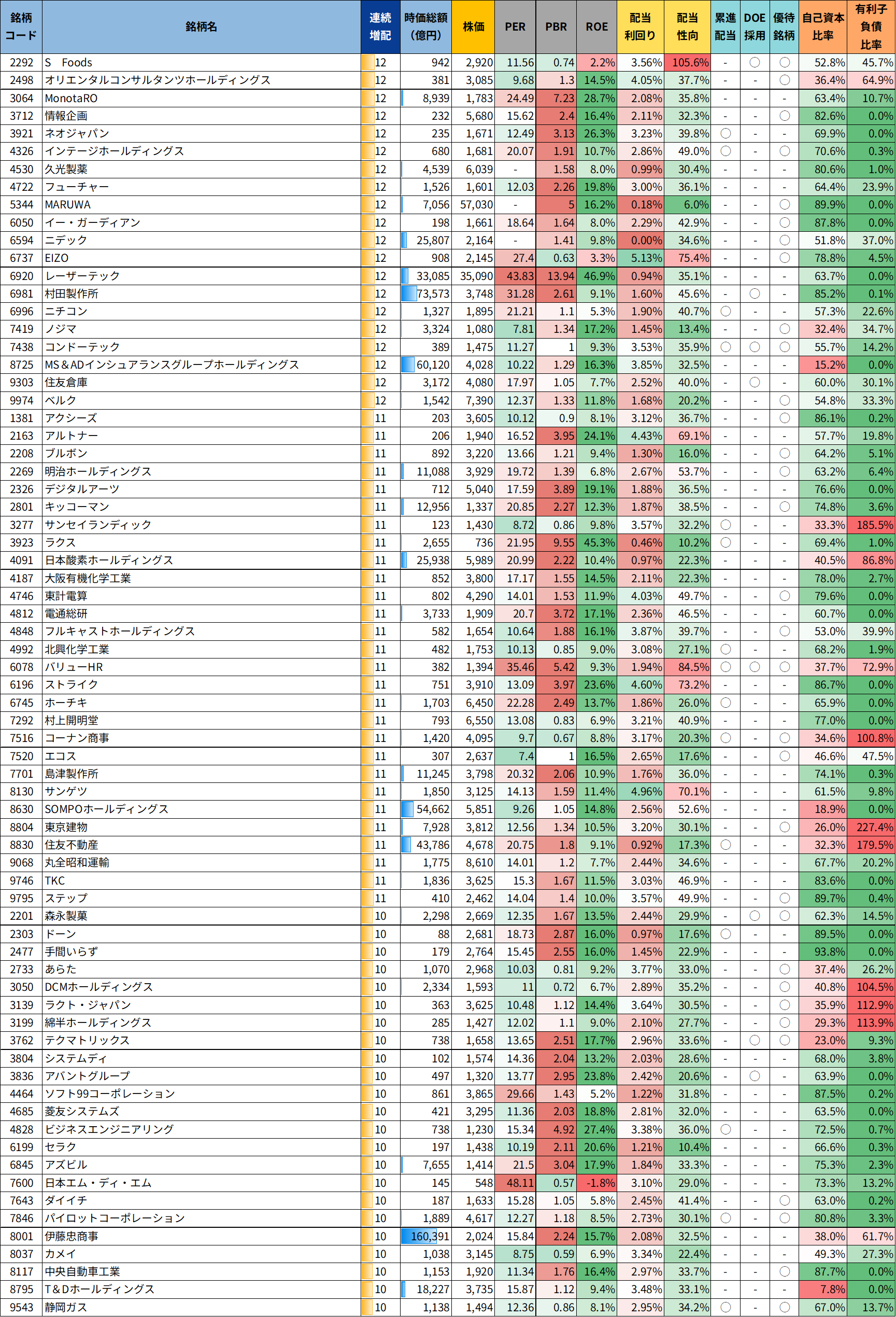 - 長期間にわたって増配を継続している企業は、業績が安定しており、株主還元を重視していると判断できます。