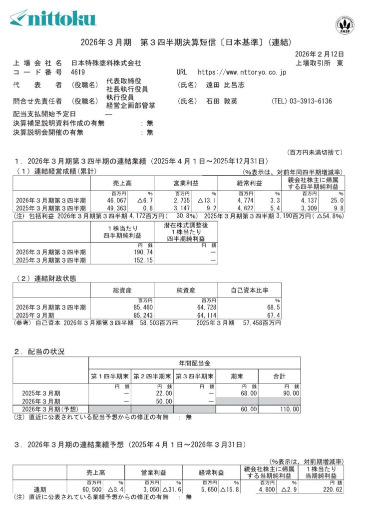日本特殊塗料は、自動車用防音材を主力とする化学メーカーです。