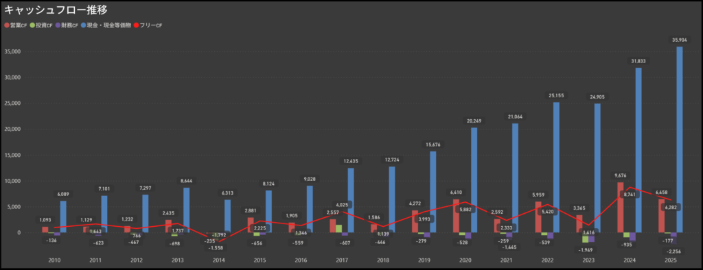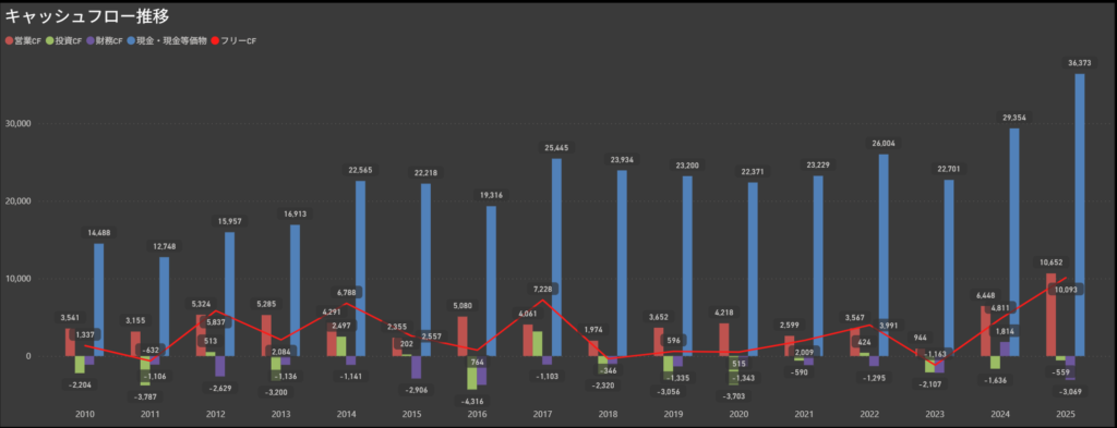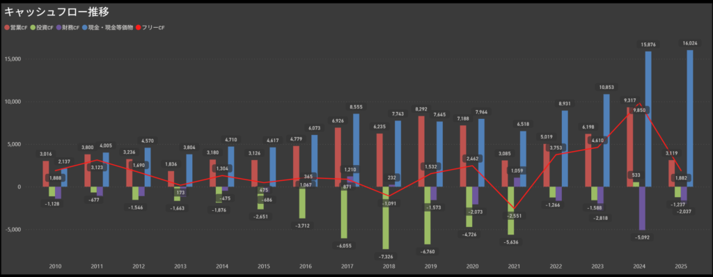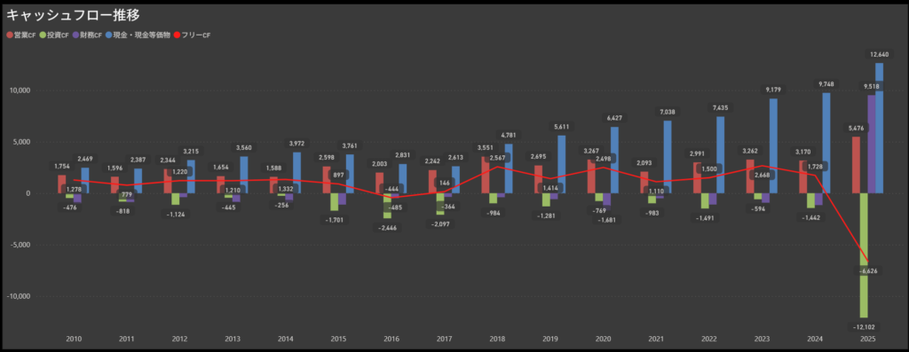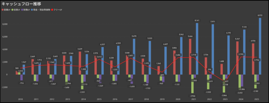 直近は投資拡大フェーズにあり、フリーキャッシュフローが大きく振れている点はやや注意材料です。