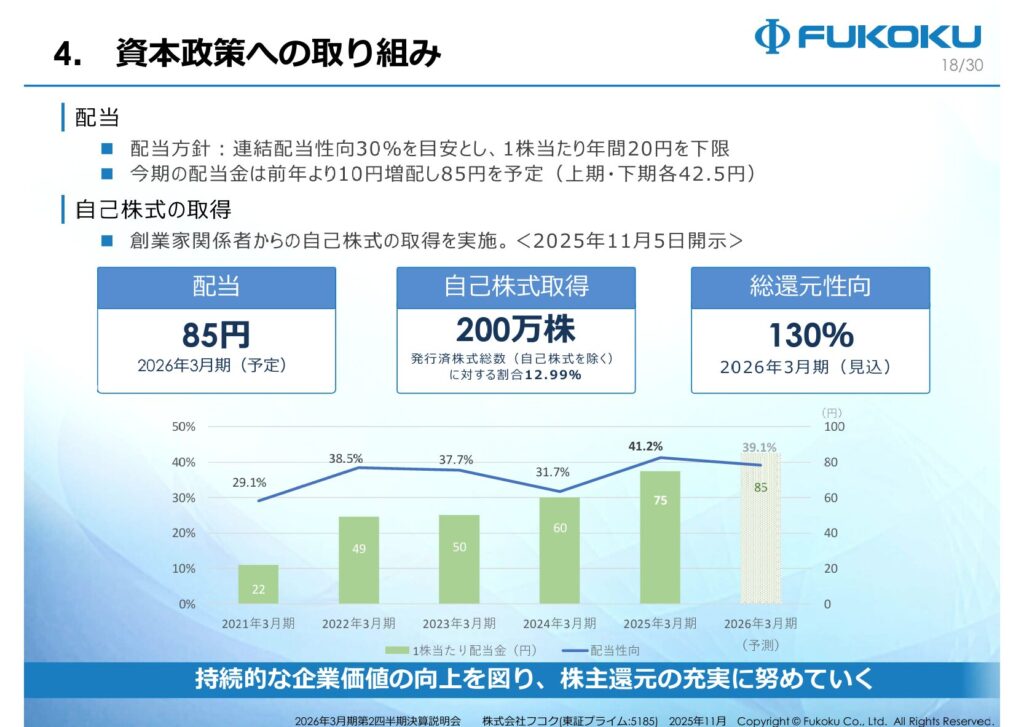 派手な還元ではありませんが、安定需要を背景にコツコツと積み上げるタイプの企業です。