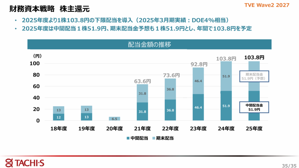 • 累進配当政策を明確に掲げ、原則として減配せず、維持または増配を継続する方針です。