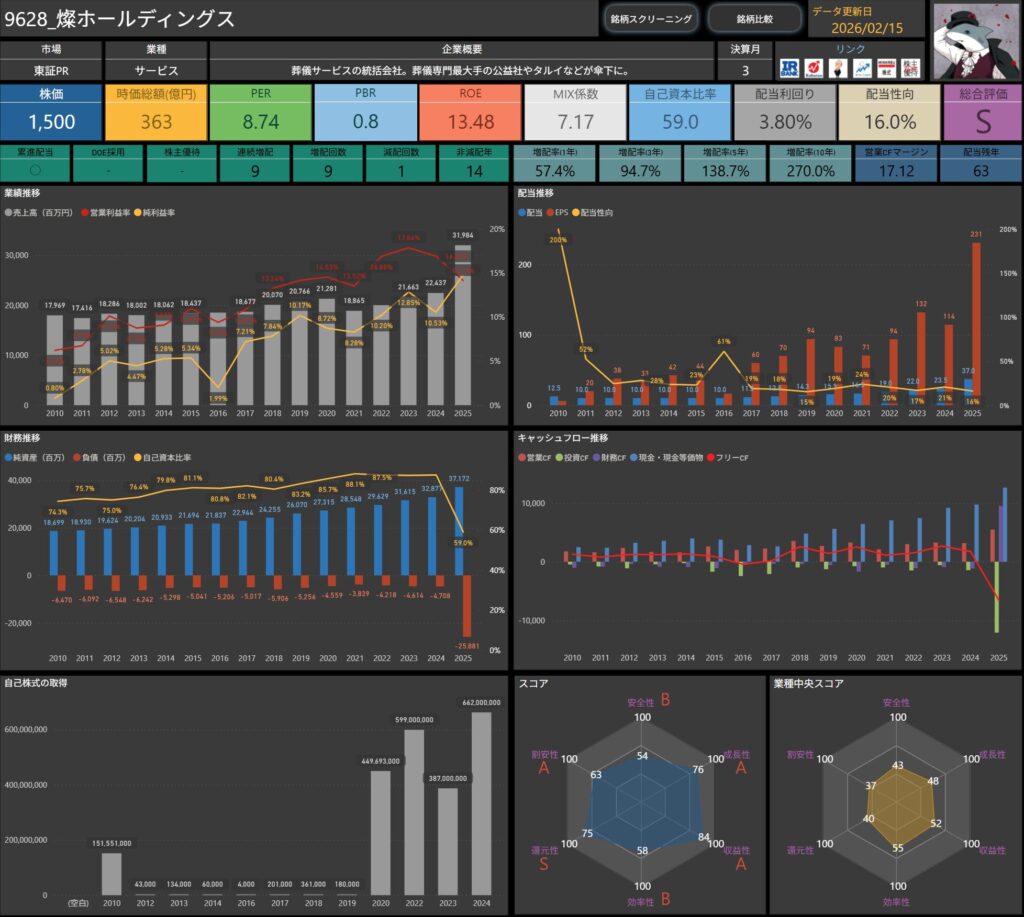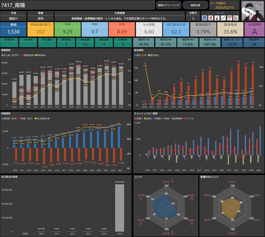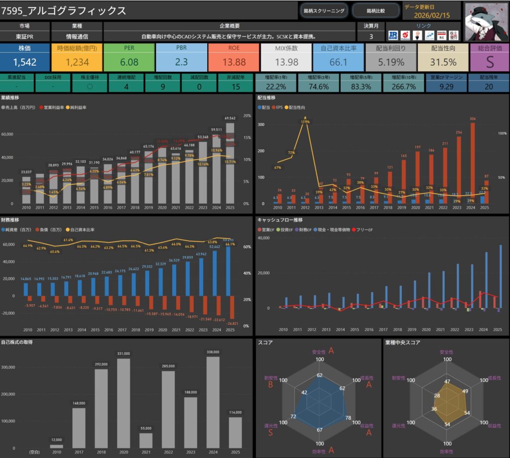 株価・配当利回り・ROE・自己資本比率などの基本データに加え、増配率やキャッシュフロー推移まで確認できます。