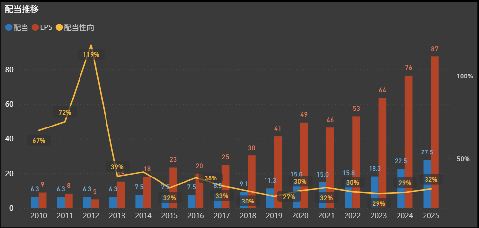 中長期で配当の継続性を重視する投資家にとっては、相性の良い還元スタイルだと感じます。