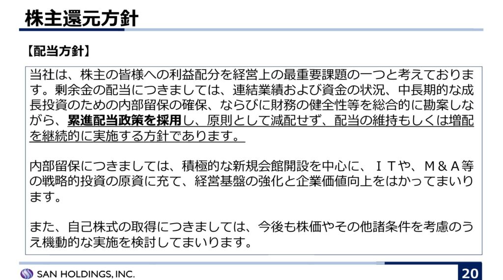 一方で、内部留保は新規出店やIT投資、M&Aなどの成長投資に充当する方針であり、成長と還元を両立させるバランス型の資本配分が見て取れます。