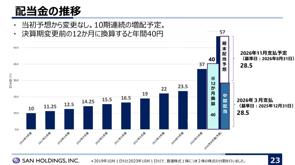 • 決算期変更前の12か月換算では年間40円相当となり、着実な増配トレンドが続いています。