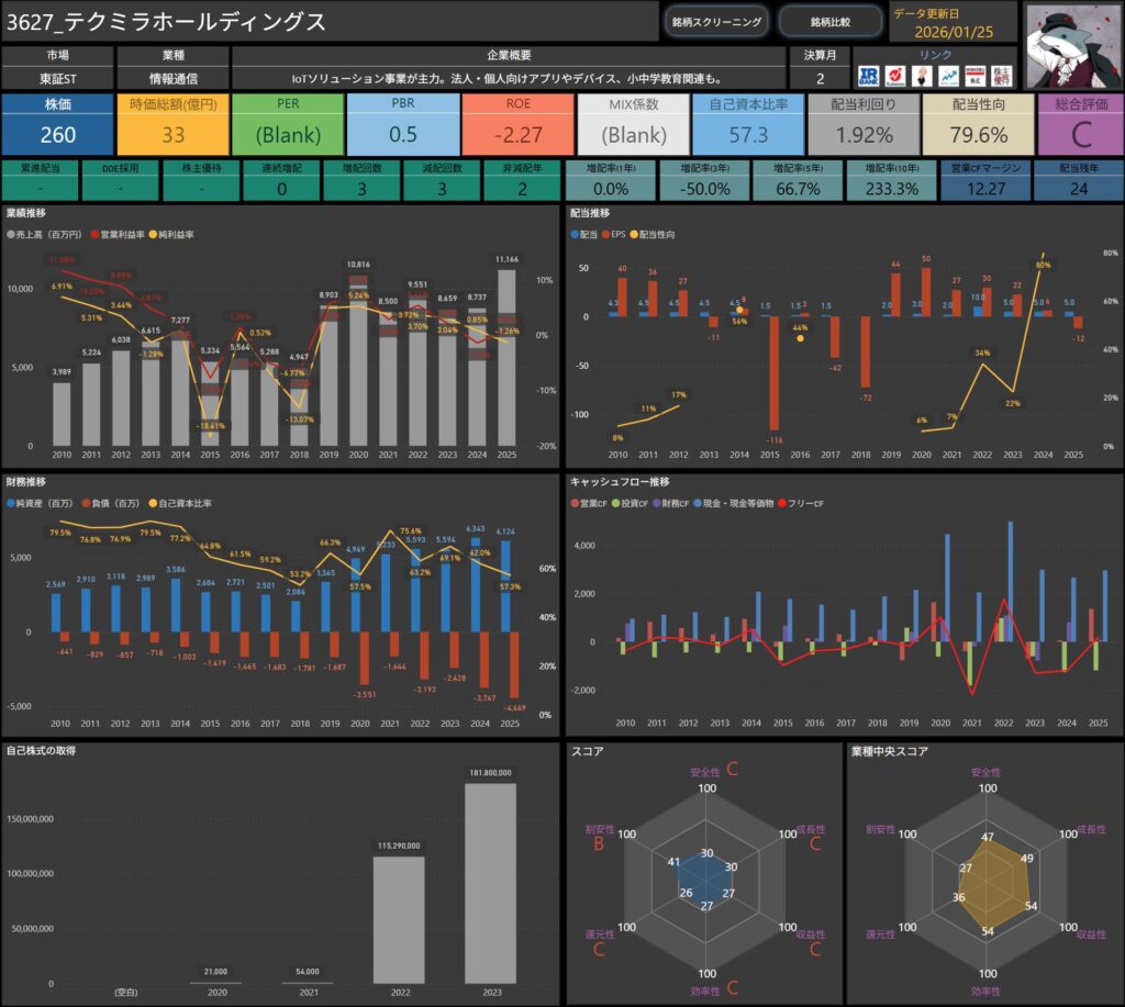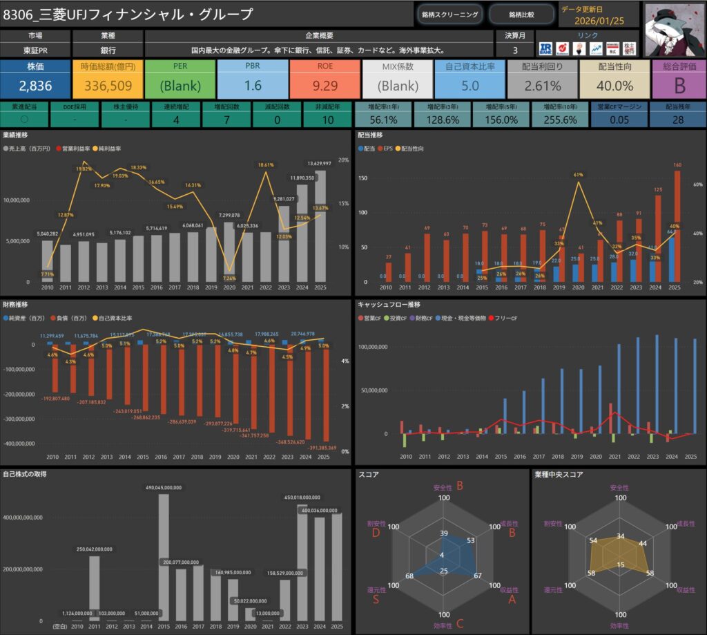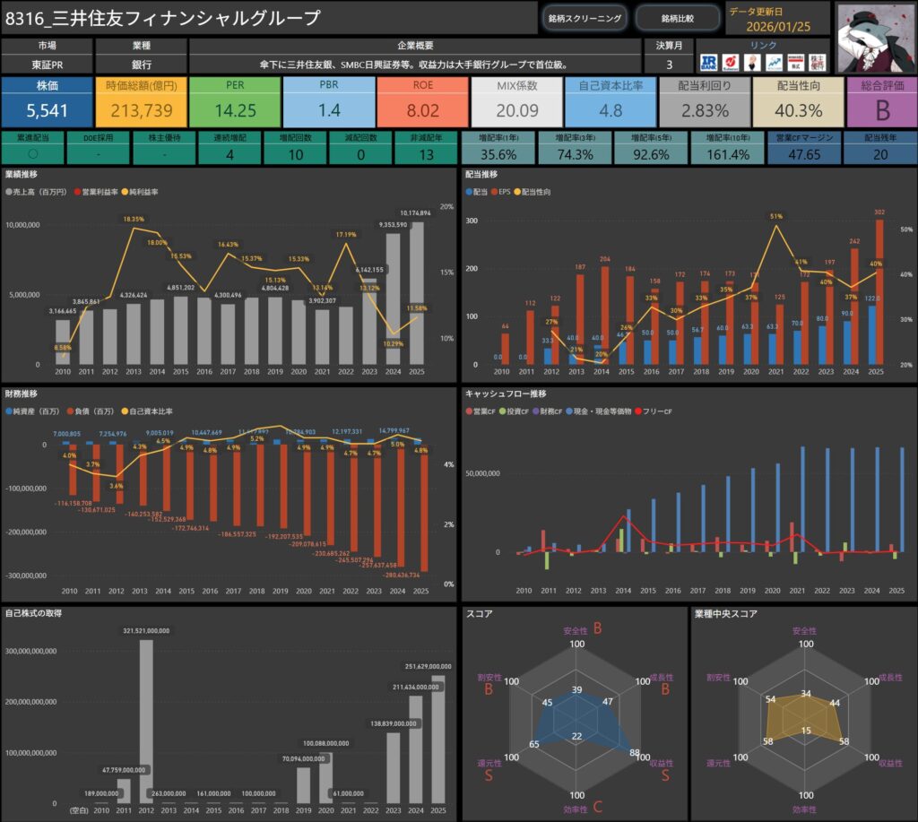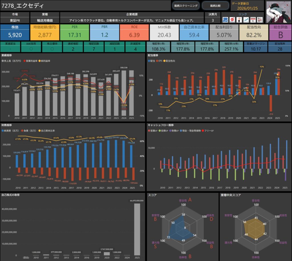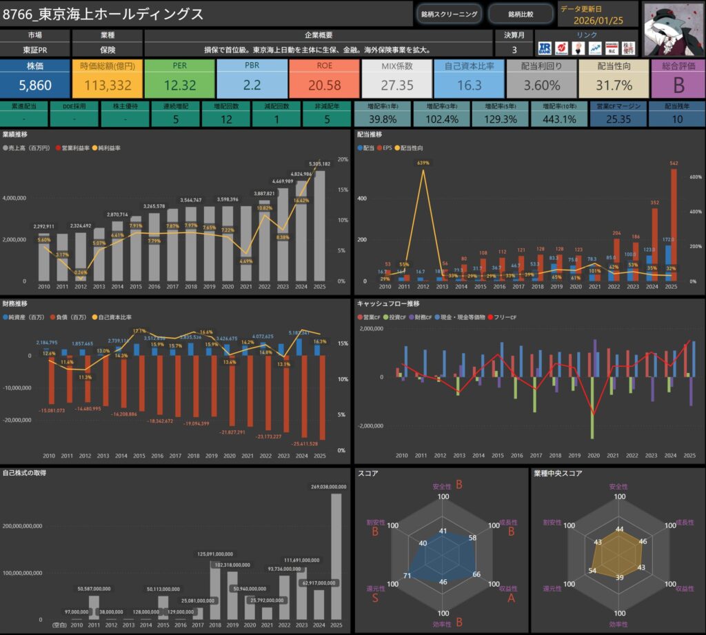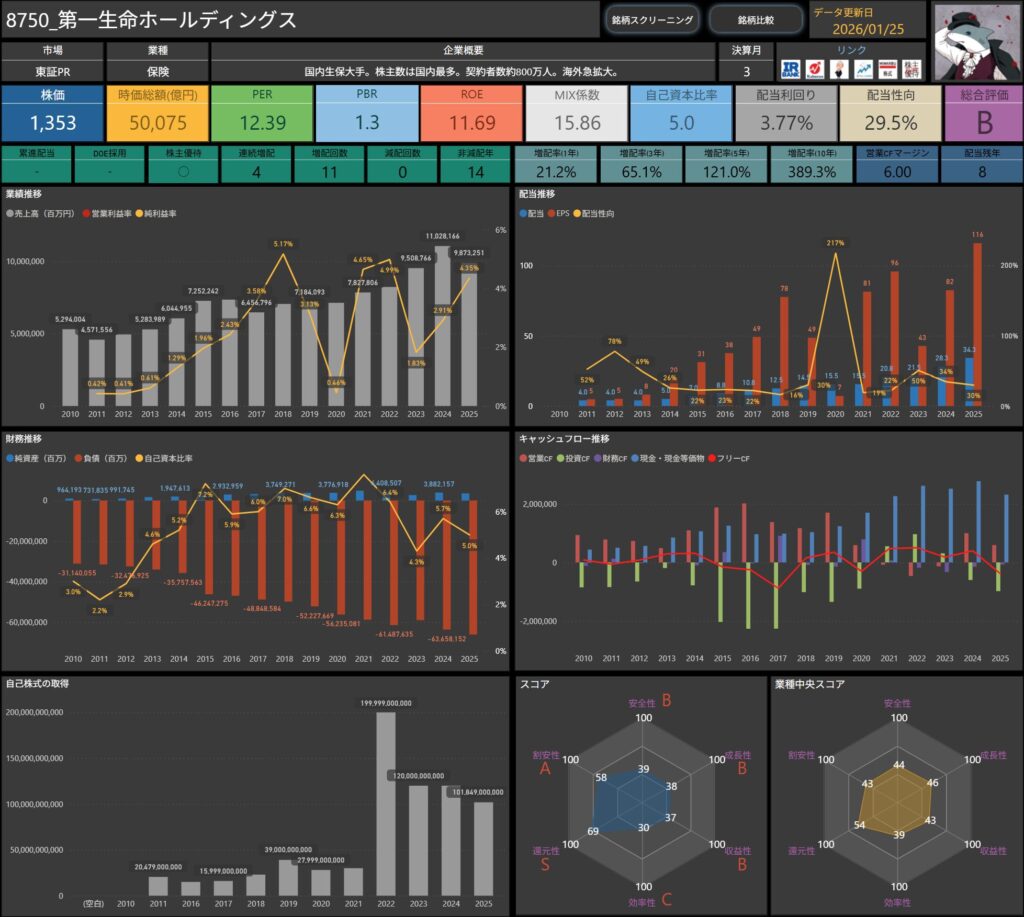 配当や各種指標、キャッシュフローなど、普段自分がチェックしている項目を、そのまま整理したものです。