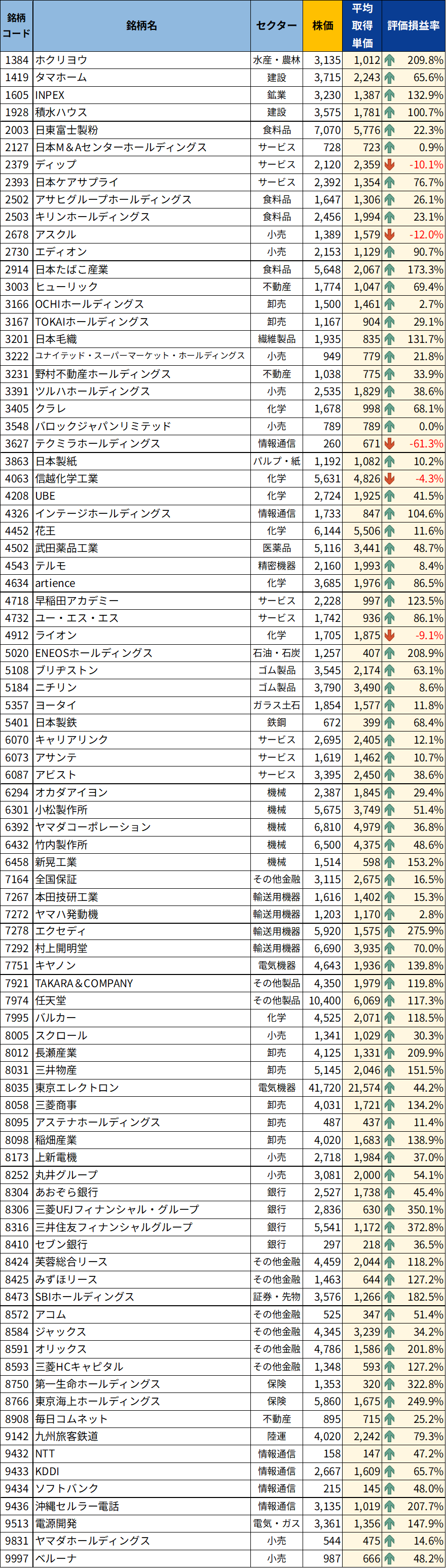 表には、株価・平均取得単価・評価損益率を載せています。